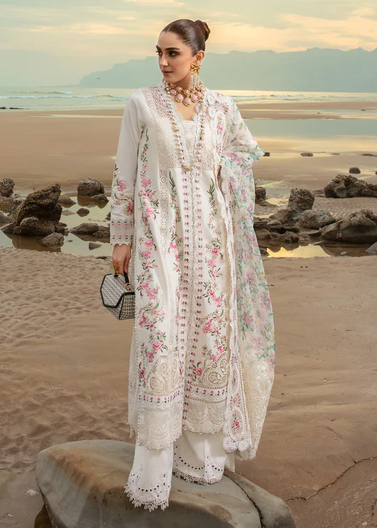• Two embroidered kalis for front • Two embroidered side panels for front • Embroidered jaal for neck • 1.6m embroidered border lace for front and back daman • Multi color embroidered organza lace for front and back • Multi color embroidered sleeves • One embroidered center panel for back • 0.5m solid dyed side panels for back • 2.66m floral booti lace on lawn • Two pair of dissolving motifs • 5.3m lace for panel seem line • 1.5m embroidered organza pallu • 5.3m embroidered organza border for duptta • Printer rocket net dupptta • 1.15m embroidered patch for pants • 2.5m solid dyed pant ”