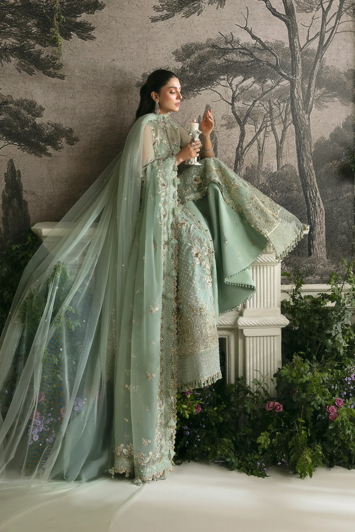 A cascading silhouette flows effortlessly, accompanied by a delicate floral filigree stole. Romance meets refinement in this couture masterpiece from Élan’s wedding festive collection.