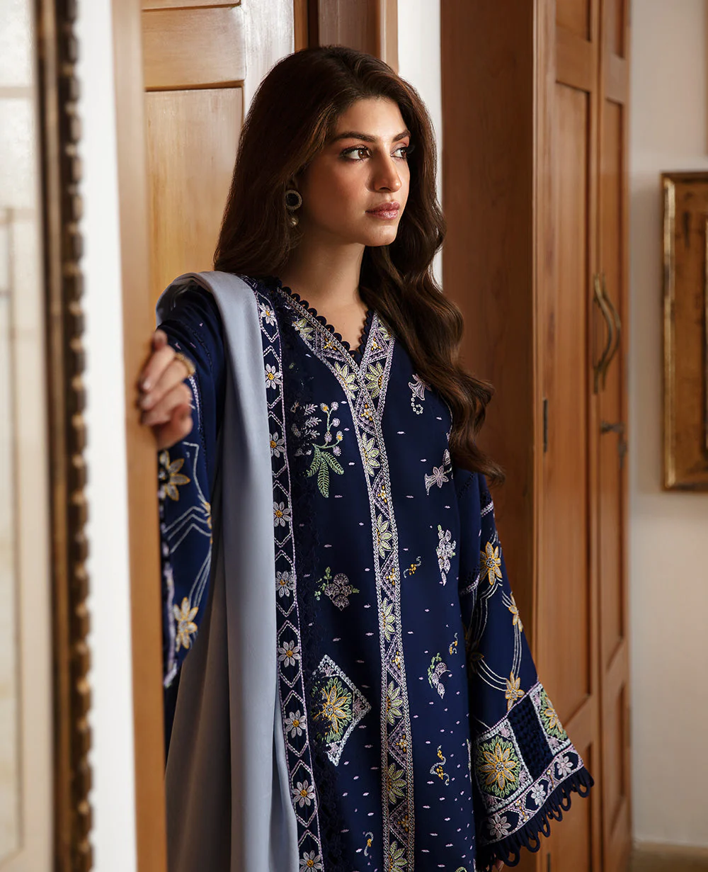 This shirt features exquisite taankas in a striking navy color, set on a rich karandi base adorned with intricate floral embroidery in lively shades of lime green, lilac, and mustard. Enhanced by carefully embroidered midnight blue borders, it radiates luxury and sophistication. When paired with a lavish grey Acrylic shawl, which boasts an embroidered frame and delicate borders, this stunning design becomes a must-have for the season, a beautiful piece that provides both warmth and elegance against the winter gloom.
